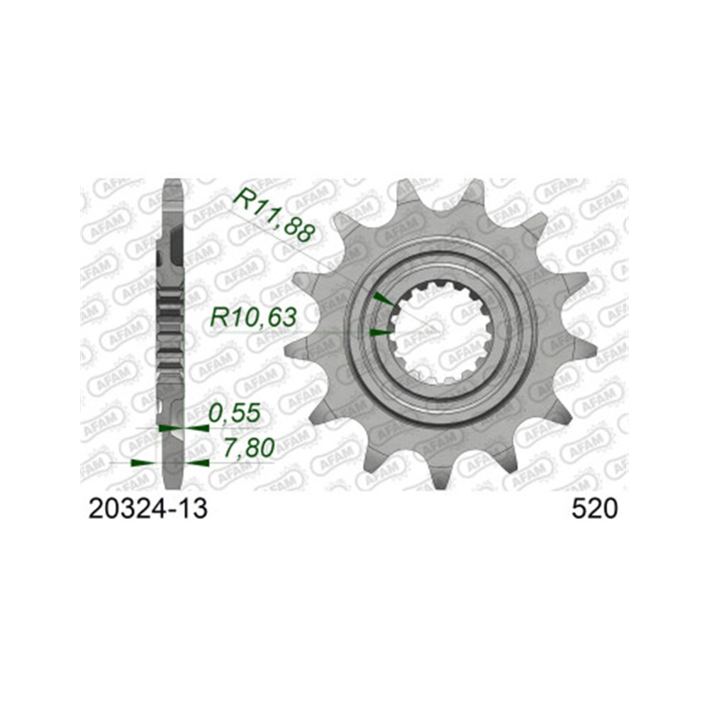 AFAM Self-cleaning front sprockets (+ in the reference) are available for MX and Off-Road use. On each side of the tooth bottom, they have a groove which evacuates sand and mud from the sprocket, this way dirt does not accumulate between sprocket and chain. This accumulated dirt causes over-tension to the chain and as a result sprocket and chain wear out very quickly and may even block your bike. With this mud grooved sprocket, you avoid these problems.