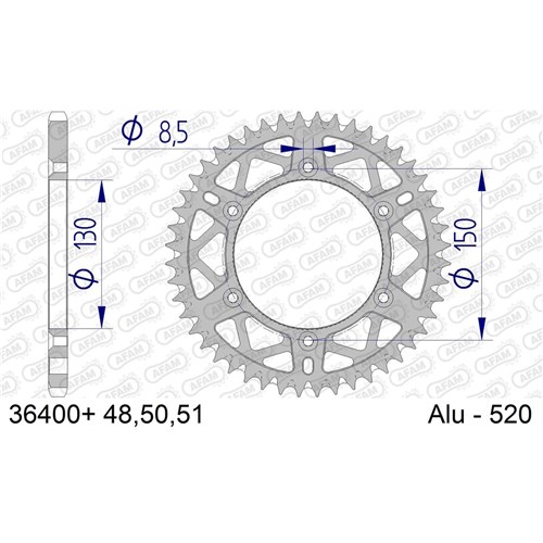 AFAM Racing Aluminium Sprockets (+in the reference) also have this harder surface obtained by hard anodizing. Most of these sprockets exist in the original pitch, but also in a conversion model for a narrower chain. These AFAM sprockets have custom tolerances for race use and a weight-saving design to ensure the most efficient transmission.