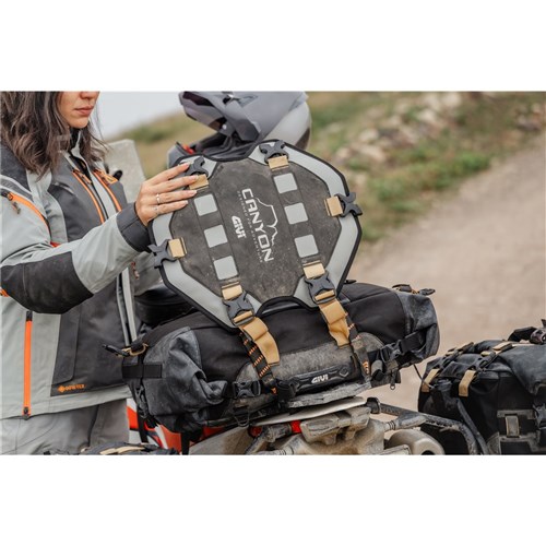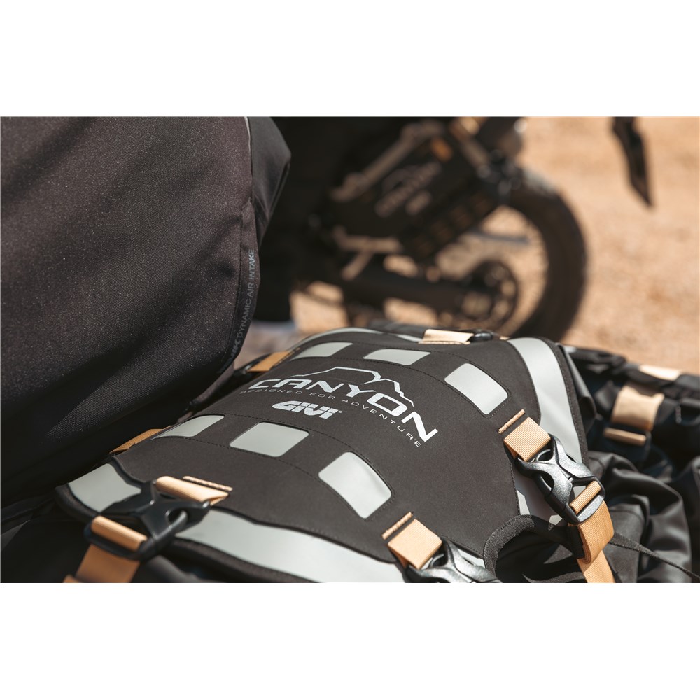 The GRT726 is attached to the saddle or rack of enduro and maxi enduro motorcycles by two straps with a steel clamp, which maintain a secure hold even over the roughest terrain. Moreover, the M.O.L.L.E. system located below the removable flap means additional loads can be attached, making it possible to combine with other models of the Canyon range such as the GRT724B cargo bag. Finally, two easily reachable external pockets are located below the removable flap and on the top of the bag.