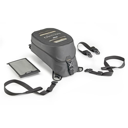 The bag is attached to the tank of enduro and maxi enduro motorcycles by four convenient cam buckle straps with end loops, making it quick to attach or release the bag from the motorcycle when you take a break. The bag can also be secured to the handlebar using a quick-release strap.