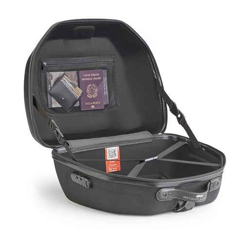 The standard technical features include inner elastic straps, a removable waterproof internal bag and the option of using an integrated combination lock for closure, while the compact dimensions are still large enough to hold a full-face helmet.
