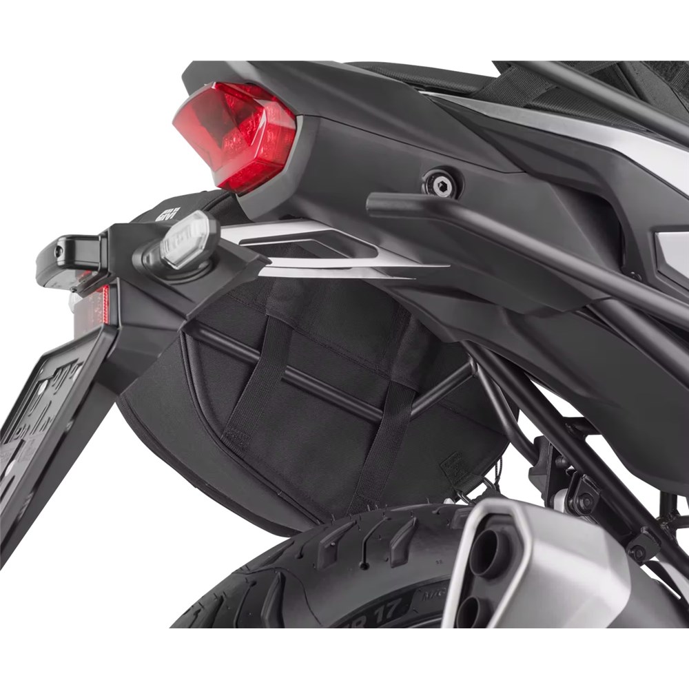 The bags are secured to the motorcycle using two Velcro straps that pass under the seat. The rear panel is designed for connection to the Remove-X system, ensuring quick and secure fastening. An additional strap to hook onto the motorcycle footpeg provides maximum stability.