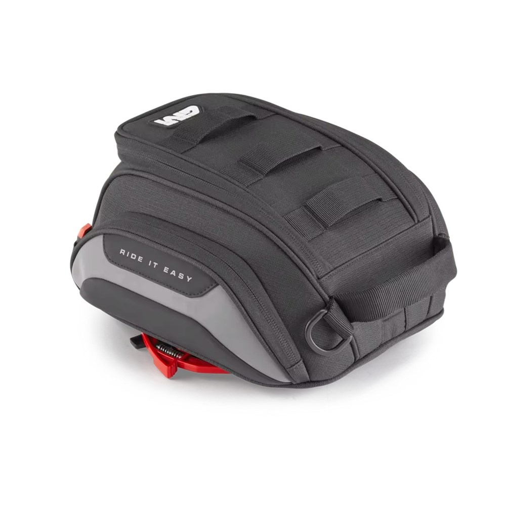 There are four possible ways to position the bag with the Tanklock fixing system, ensuring maximum flexibility when attaching to different types of tank. Holes compatible with specific models like the Honda Africa Twin, Transalp and Kawasaki Versys are also provided for.