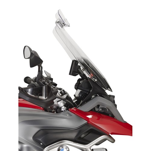 Universal transparent spoiler that can be mounted to fairings / windscreens; the aluminium fitting kit allows both the height and angle to be adjusted.