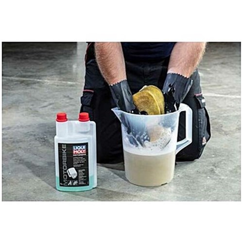 Place filter in suitable vessel. Mix cleaner with water. Depending on the degree of contamination, the dosage must be between 1:5 and 1:10 (1-part cleaner to 5-10 parts water). Plunge the filter entirely into the cleaning solution and allow to work for 5-10 minutes. Then carefully knead the filter in the solution until it is completely clean both inside and outside. Do not under any circumstances wring the filter out, as this could cause damage. Then rinse the filter out under fresh water until the cleaner has been flushed out completely. If any stubborn contamination remains, repeat the process if necessary. Allow the filter to dry in the ambient air before installation. Then wet with LIQUI MOLY Motorbike Air Filter Oil.