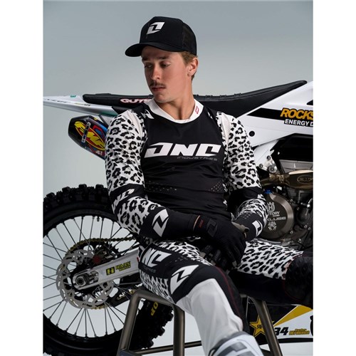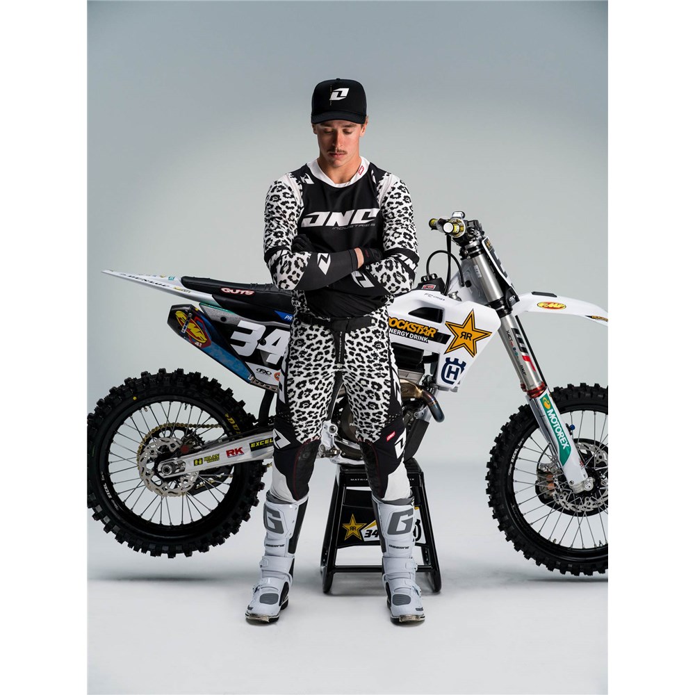 Snow Leopard is a cold-blooded statement inspired by team rider Julien “Juju” Beaumer’s unforgettable 2025 Anaheim 1 SX walk-in fit. Drawing from his can’t-miss, animal print fur coat, this gear blends high-contrast leopard patterns with an unapologetic race-day attitude. Clean, aggressive, and impossible to ignore, One Industries X-197 Snow Leopard is built for riders who show up loud and leave no tracks untouched.
