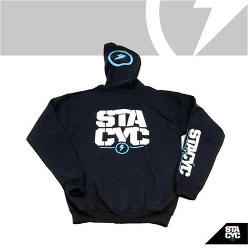 KEEP THE PIT CREW WARM WHILE THE LITTLE RIPPER EXPLORES ON TWO-WHEELS ADULT PULLOVER HOODIE - BLACK WITH STACKED STACYC LOGO ON THE FRONT AND BOLT ICON ON THE HOOD