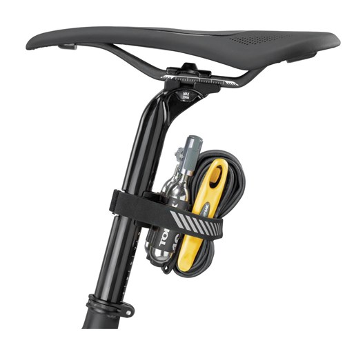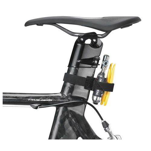 The AirBooster Race Pod X is a compact and completely self-contained tire inflation kit featuring an AirBooster CO2 inflator, two tire levers, two 16g CO2 cartridges, mounting module with strap. The unique mounting module straps to the aero or round tube, and provides lightning fast access to the AirBooster inflator, extra CO2 cartridge and tire levers. The perfect CO2 tire repair solution for racing, endurance or triathlon events.