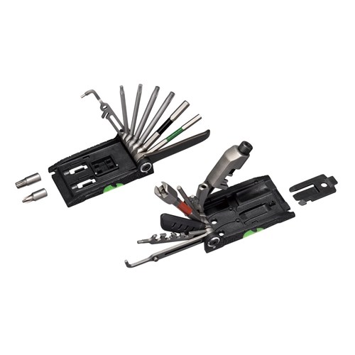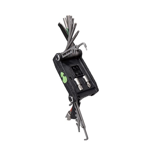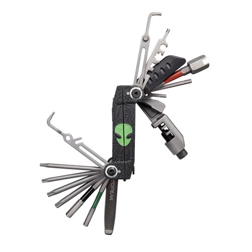 The evolution of the world famous ALiEN tool transforms the X into the ultimate 34 function pro quality folding tool. The ALiEN X features T10 / T15 / T20 / T25 / T30 Torx® tools and adds a master link pliers for use on master link equipped single/multi-speed chains. Two piece design allows easy access and full use of all tools and adds leverage when tightening bolts. Includes self-tightening tools and a nylon bag.