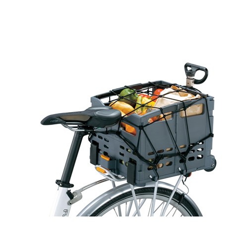 Elastic nylon cargo net attaches to Topeak TrolleyTote™ or other basket types and keeps contents safe and secure while riding. Attaches to rack or basket with durable, coated hooks.