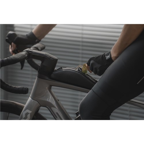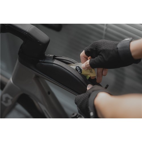The most compact, aerodynamic top tube fuel box minimizes wind drag while eliminating interference with legs. Mounts by secure scratch-free straps for quick and convenient access to energy bars, gels, or other energy items you need.