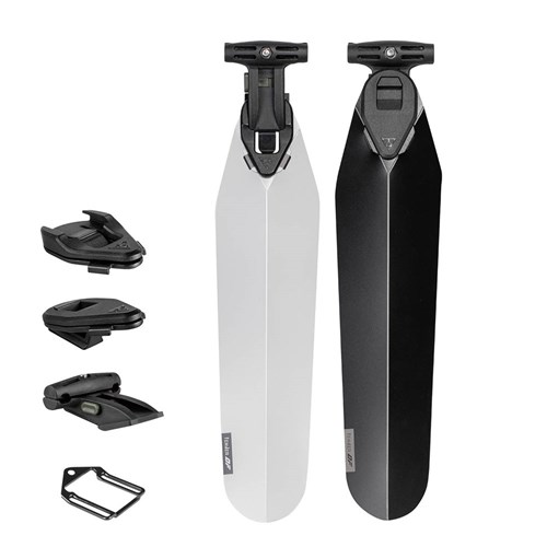 Durable polypropylene fender is ultralight, stylish, and simple to slide and click then ready to go when wet weather arrives. Included Duo Fixer allows fast and easy tool-free mounting and removal and provides dual use with Topeak Duo Fixer system accessories, including Topeak QuickClick saddle bags or most strap type saddle bags, Tubi tools, CO2 inflators, and lights underneath the saddle. Black and transparent colors with exchangeable upper and lower backets as a set for the color options and mounting position option to suit different needs.