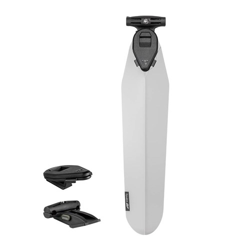 Durable polypropylene fender is ultralight, stylish, and simple to slide and click then ready to go when wet weather arrives. Included Duo Fixer allows fast and easy tool-free mounting and removal and provides dual use with Topeak Duo Fixer system accessories, including Topeak QuickClick saddle bags or most strap type saddle bags, Tubi tools, CO2 inflators, and lights underneath the saddle. Black and transparent colors with exchangeable upper and lower backets as a set for the color options and mounting position option to suit different needs.