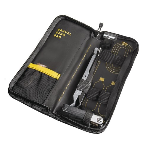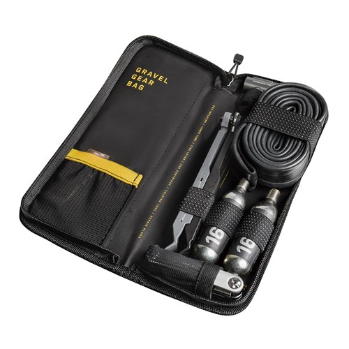 A complete tubeless tire repair / CO2 inflation kit for road and touring enthusiasts packed into a sleek, under top tube mounted organizer case. Internal organizer keeps gear neatly and securely in place. Includes Tubi 11, Power Lever X, 3 pcs of 3.5mm x 5cm tire repair plugs, and AirBooster CO2 inflator with enough room to carry two 16g CO2 cartridges and a spare tube up to 700 x 40c.