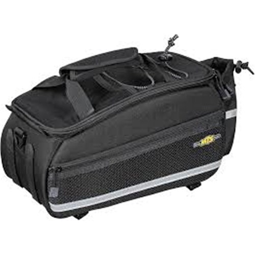Dual molded side panels combine with flexible 600 denier fabric to form a semi rigid, weather resistant trunkbag. Features a divided main compartment with mesh side compartments and rear water bottle holder. Attaches with integrated straps.