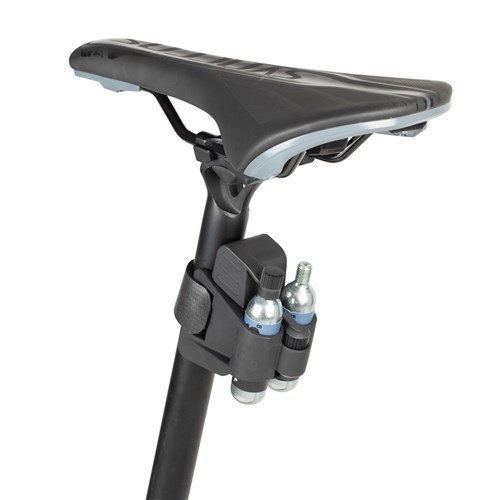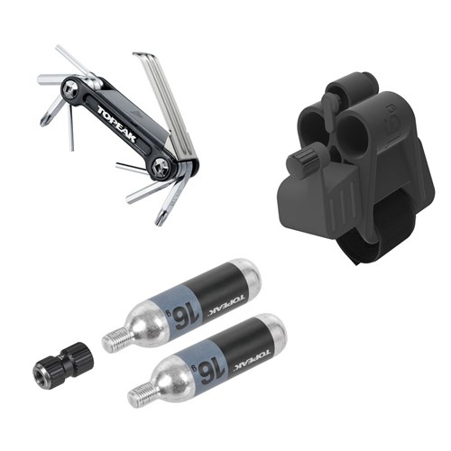 A compact frame tube mount, tire repair and CO2 inflation kit features Nano AirBooster CO2 inflator, two 16g CO2 cartridges, and Mini 9 Pro folding tool for road bikes. Included mounting module with grip strap allows the NanoMaster RXT to be attached to a seatpost or seat tube with ease.