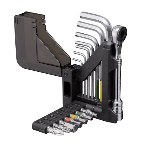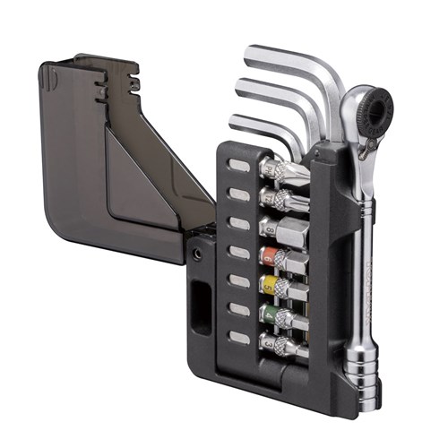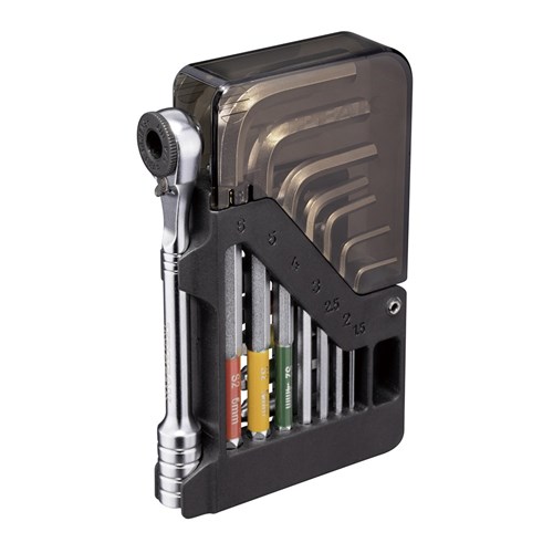 An incredibly compact 15 function ratchet set with ball-end hex wrench set. 7 ratchet bits and 7 ball-end Allen wrenches are stored in an innovative organizer folding body that’s small enough to fit in a jersey pocket or saddle bag.