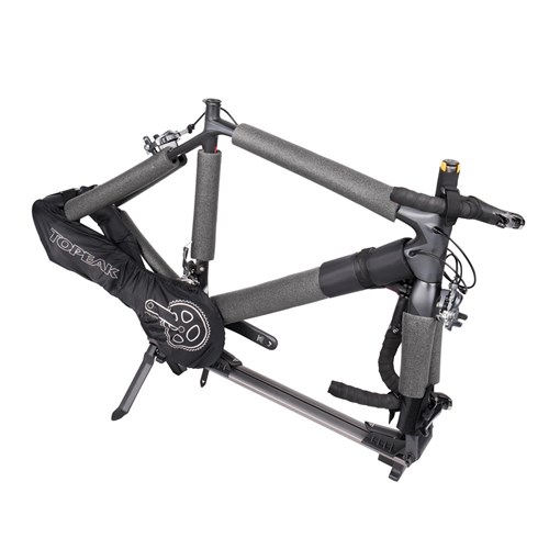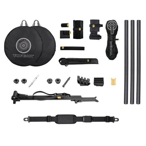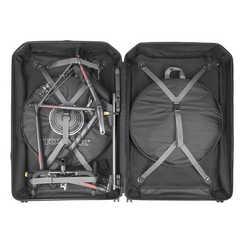 An easy to pack / unpack bike travel case for time trial / triathlon bikes and larger frame-size road bikes. Features high-impact strength, lightweight and flexible, Makrolon® polycarbonate shell reinforced with an aluminum mounting system. The upright case design with four large ø60mm multi-directional wheels allows luggage-like ease when rolling and includes a built-in TSA lock and carry handles for secure and easy transport. Two wheel bags, protective sleeves, and drivetrain cover provide protection against scratches and grease stains, and inner pockets help keep your gear organized all the way to your final destination. When you arrive, the mounting system extends as a mini workstand to hold your frameset steady and allow re-assembly and fine tuning.