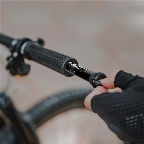 An easily accessible hidden compact chain tool kit housed in handlebar ends for your mountain bike. Features CrMo steel chain tool for single and multi-speed chains up to 13 speed, including Sram® Flattop chains and Campagnolo® hollow pin chains. Included chain hook holds links during assembly.