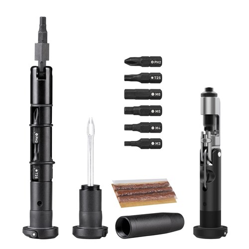 A set of three easily accessible hidden compact tool kits that allows any tool set combination to be inserted into your handlebar. The perfect tool companion for your mountain bike. The kits come 3.5mm plug insertion tool for tubeless tire repairment and a full set of 3 / 4 / 5 / 6 / 10mm hex bits, T25 Torx® bit, and #2 Phillips bit for bike maintenance, and chain tool with chain hook for all speed chains.