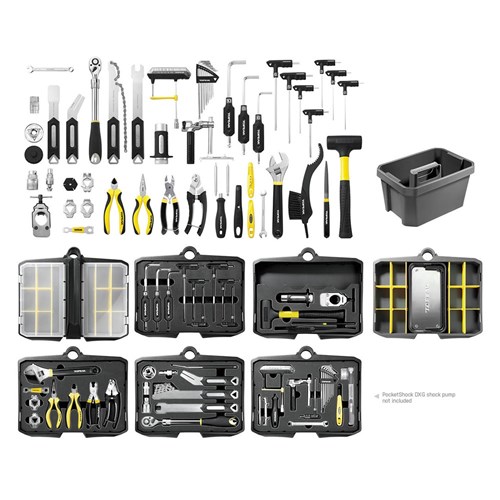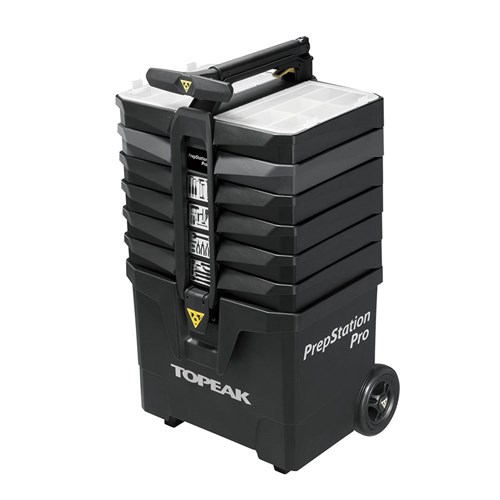 Easy moving trolley tool station with 5” wheels and seven tool compartments containing 55 professional shop quality bike tools (85 functions). Wheel base can be easily pulled out to extend working base for better stability. Push button Lift Handle opens tool trays for quick and easy repairs.