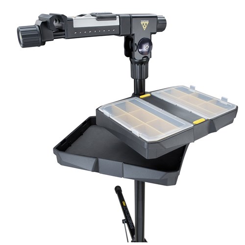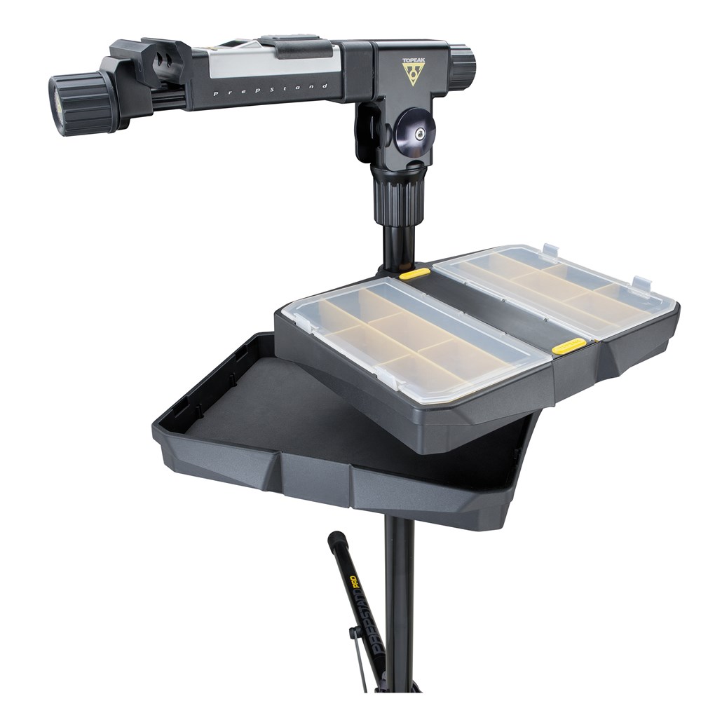 Convenient holder for tools and small parts. Divided compartments keep small parts organized. Transparent lids to easily find parts. Clamp on upper extension of PrepStand™ Pro, Elite and Race.