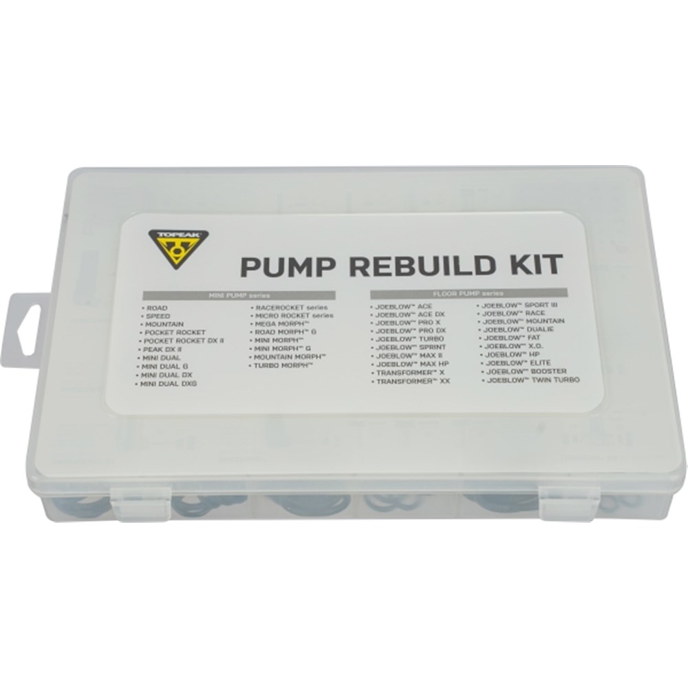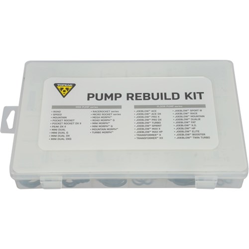 A complete rebuild kit of plunger o-rings and pump head parts for Topeak floor pumps and mini pumps.