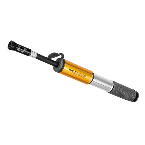 Designed to meet the demands of a professional racing and training schedule this elegant and sleek mini pump features a full aluminum body, head and pump handle. An extendable hose helps take stress off the valve stem and the dependable single action stroke fills tires fast. The RaceRocket®’s compact size easily fits in a jersey pocket and its low weight is welcome on long training rides and endurance races. Note: Use the PCT Cap to tighten or remove two piece Presta valve cores when necessary.