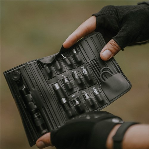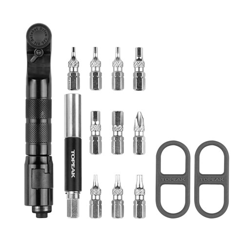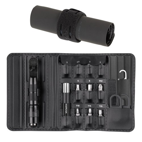 A compact roll-up, multi-function ratchet tool set with chain tool has everything you need to fix and make precise adjustments to your bike while on the road. Features a fine tooth ratchet mechanism with reverse lever and thumb wheel for quick rotation and control in tight spots and includes Speed Sleeve bit holder, hardened steel tools in 2, 2.5, 3, 4, 5, 6mm hex, T10, T15, T25 Torx®, #2 Phillips bits, chain tool, and chain hook. The ultrasonic welded roll-up pack keeps things organized and secure, and even has a pocket to store two silicone straps for carrying one 16g CO2 cartridge and two tire levers.