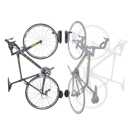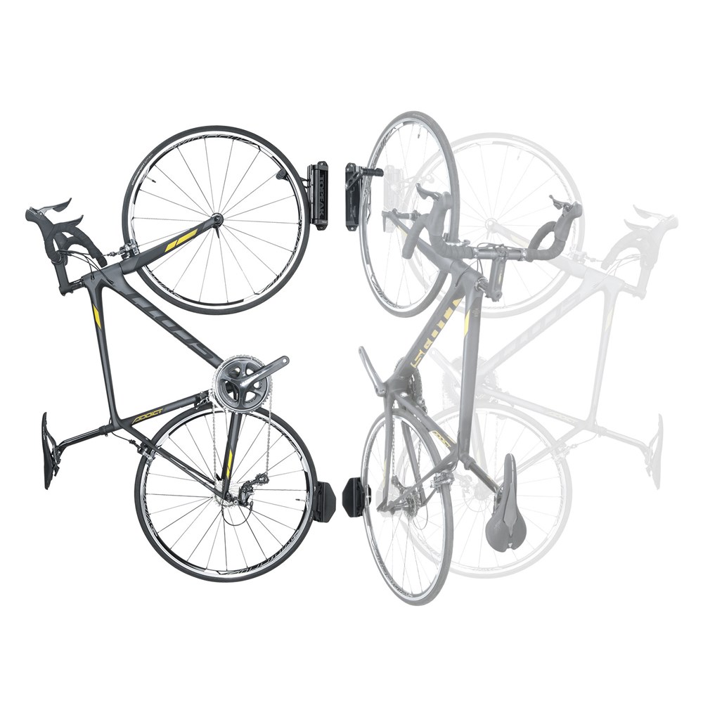 Compatible with wheel / tire combinations having an overall height of 3.15" (8cm) and tire width up to 2.6" This elegant wall mounted bike holder allows you to store one bike and swing it to either side to optimize storage space. A molded rubber bar keeps the front wheel stationary, preventing the bike bike from twisting and includes all mounting hardware plus a molded rear wheel pad to prevent tire marks on the wall. Fits standard road and mountain bikes up to 29" wheels. Not compatible with fat tire bikes.