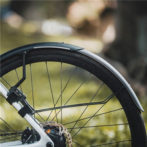 The perfect quick-mount, dual color front fender that attaches to road bike forks with hook and loop straps easily and securely. Adjustable struts provide a closer fit to the tire and excellent mud / spray protection while the highly polished underside helps prevent dirt buildup and aids in cleaning. Included 3M reflective decals provide safety at night.