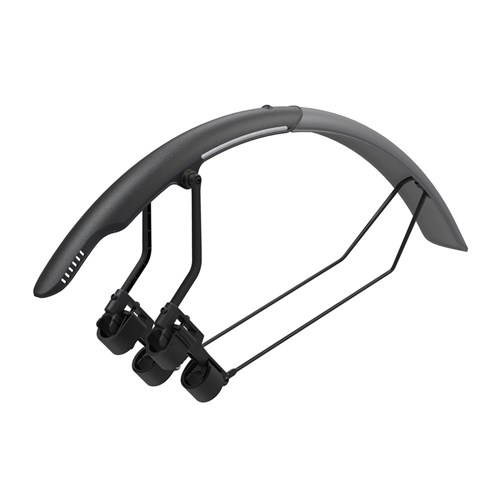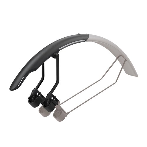 The perfect quick-mount, dual color rear fender that attaches to road bike frames with hook and loop straps easily and securely. Adjustable front struts provide a closer fit to the tire and excellent mud / spray protection. Unique two-piece, dual tone design provides short or longer fender usage options for a precise fit with your bike. A highly polished underside helps prevent dirt buildup and aids in cleaning. Included 3M reflective decals provide safety at night.