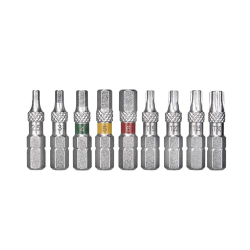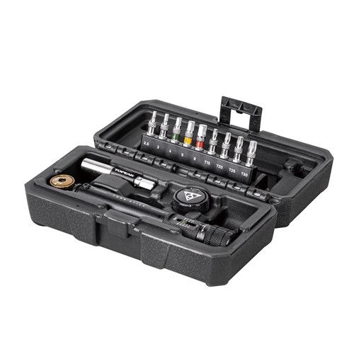 Torq Stick 2-10Nm Pro version. Torque wrench with adjustable preset range of 2-10Nm features a standard hex drive reversible ratcheting head. Includes magnetic bit holder for adding leverage, fingertip bit holder for narrow space, and 9 tool bits with a generous 30mm length for reaching tough bolt locations. Knurling on the individual tool bits provides additional grip when changing or removing from the organizer and ratchet tool head. Fits neatly into a storage box.