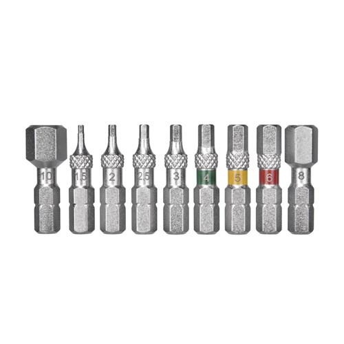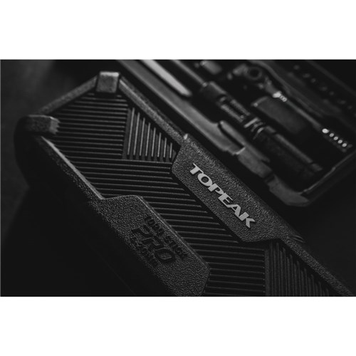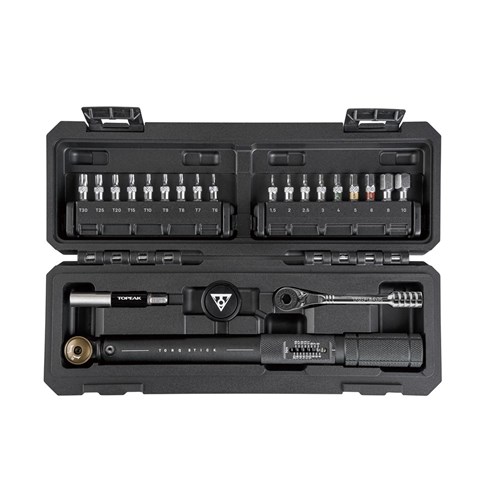 Torq Stick 4-20Nm Pro version. Torque wrench with adjustable preset range of 4-20Nm features a standard hex drive reversible ratcheting head and a fine tooth ratchet mechanism with reverse lever and thumb wheel for quick rotation and control in tight spots. Includes magnetic bit holder for adding leverage, fingertip bit holder for narrow space, and 18 tool bits with a generous 30mm length for reaching tough bolt locations. Knurling on the individual tool bits provides additional grip when changing or removing from the organizer and ratchet tool head. Fits neatly into a storage box.