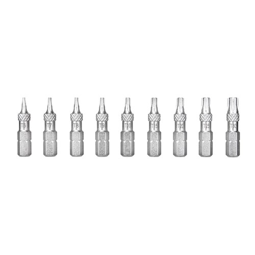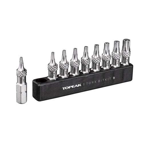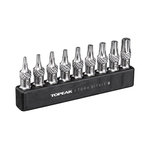 A complete 9 piece Torx® bit set for road and mountain bike repair and maintenance. Designed to work with all Topeak ratchets and torque wrenches as well as other brand ratchets and bit drivers. Generous 30mm bit length makes it easy to reach tough bolt locations and knurling prevents fumbling when changing bits or removing bits from the organizer.