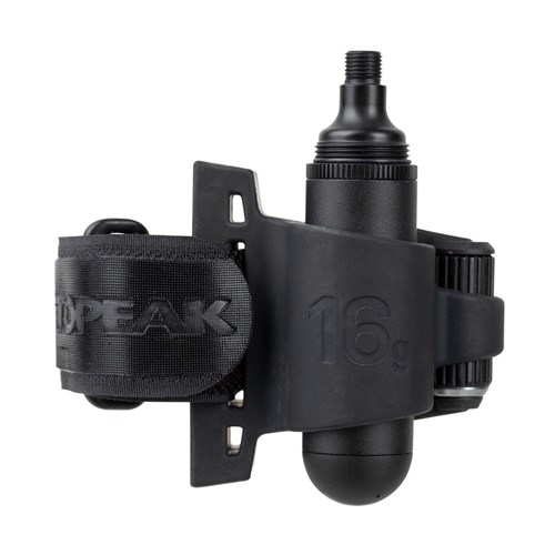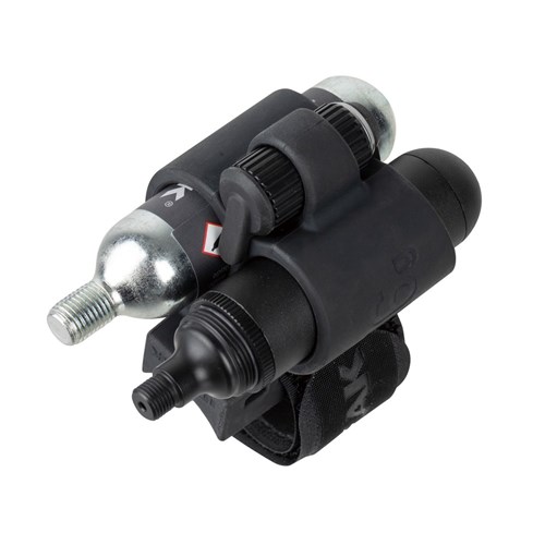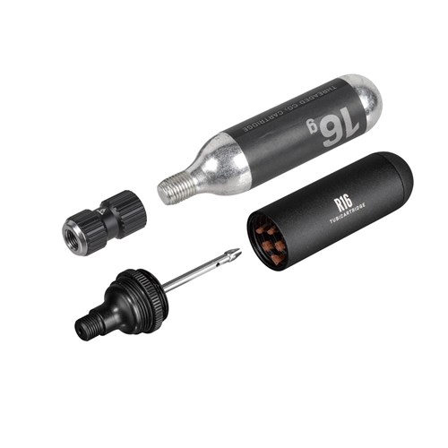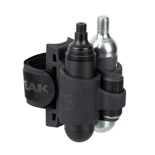 A compact frame tube mount, multi-function tubeless tire repair and CO2 inflation kit features Nano AirBooster CO2 inflator, TubiCartridge R16 and one 16g CO2 cartridge for road bikes. Included mounting module with grip strap allows the TubiMaster RX to be attached to seatpost or bike frames with ease.