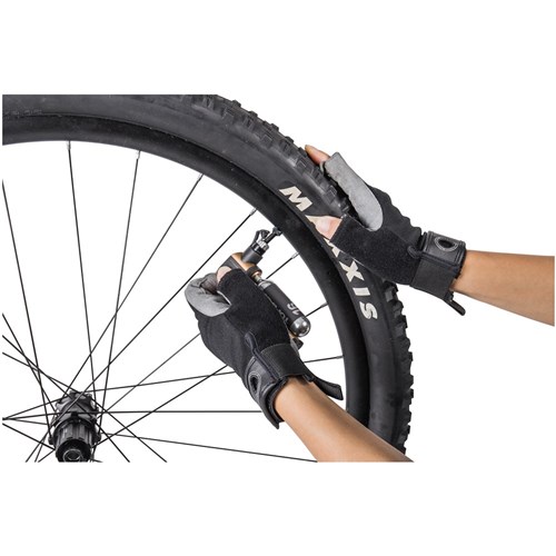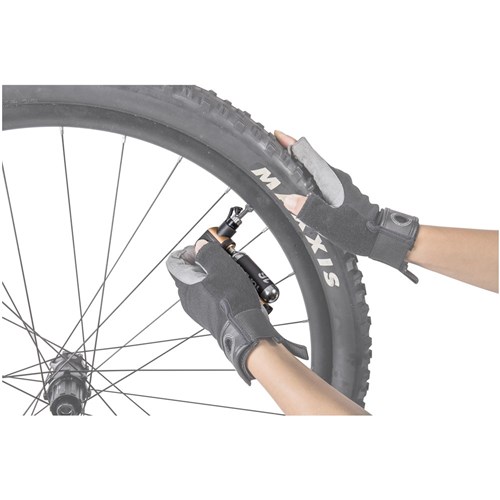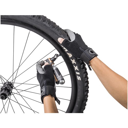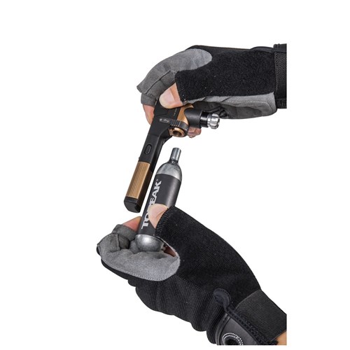 A compact, all-in-one tubeless tire repair kit and CO2 inflator makes quick work of repairing flats on the road or trail. CO2 inflator head fits Presta & Schrader valves and carries a single threaded 16g or 25g CO2 cartridge. Tire reamer, serrated knife and plug insertion tools fold away into tool body while a special concealed compartment holds repair plugs. A mounting module lets Tubi Master+ attach to seatposts or bike frames with included strap.