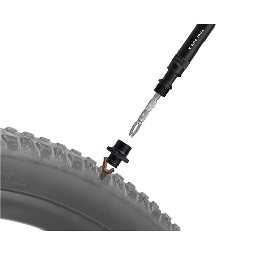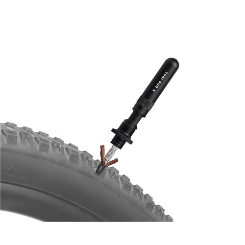 A compact, tubeless tire repair kit. Tubeless repair tools store inside a machined pod while five tire plugs store in a lightweight polymer pod. Both pods secure to a mounting module that can be strapped to a frame tube or seatpost – ready and waiting for action.