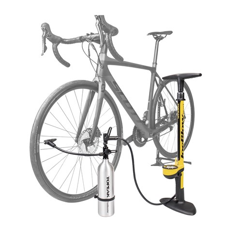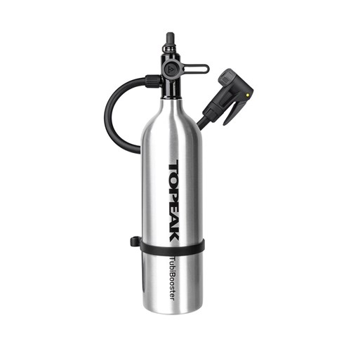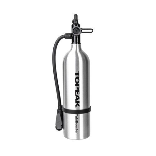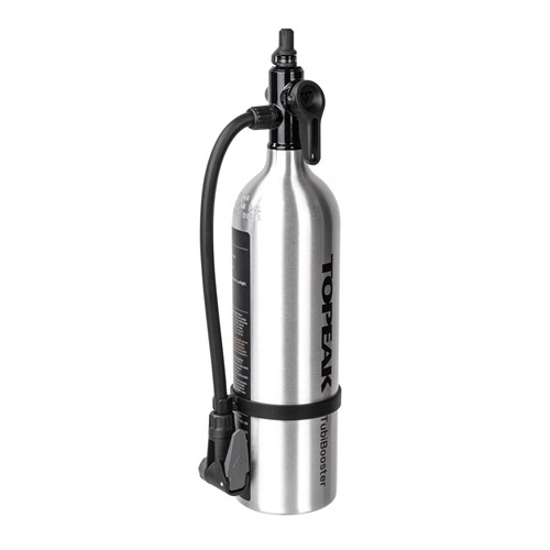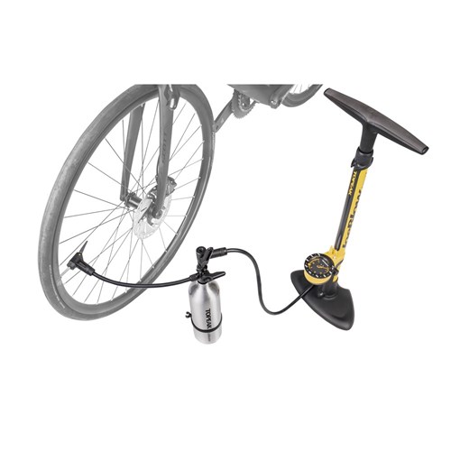 An aluminum air chamber with inflator head that stores an air charge of one liter, up to 200 psi / 14 bar. Works with a floor pump to quickly fill your tires and ensures proper installation on a tubeless rim at home. Once you flip the selector from “CHARGE” to “INFLATE” mode, air bypasses the chamber as you use the floor pump to inflate your tire to the perfect pressure. An integrated flexible hose with pump head works with Presta and Schrader valves and takes stress off the valve stem while pumping.