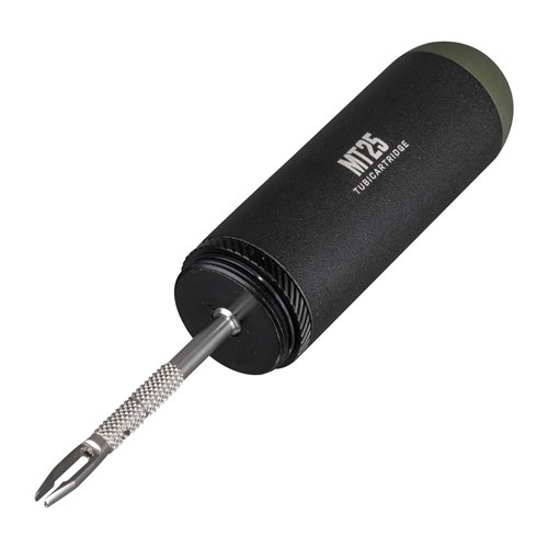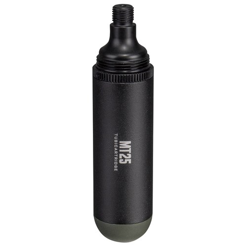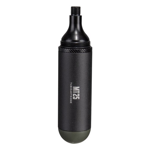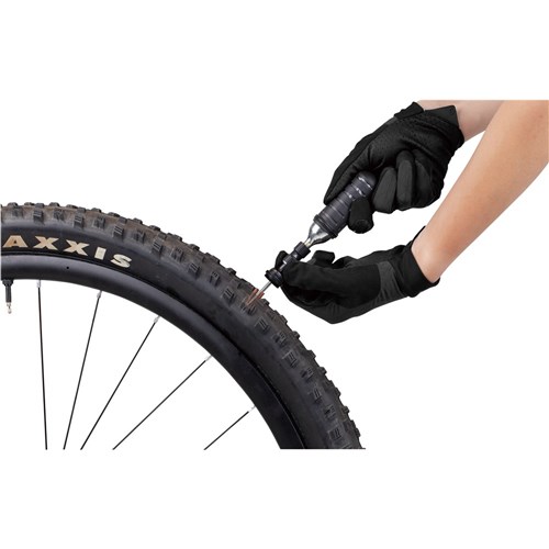 A MTB tubeless tire repair kit stored compactly in a CO2 cartridge style pod used alone for tire repairs or additionally with CO2 inflator for tire inflation.
