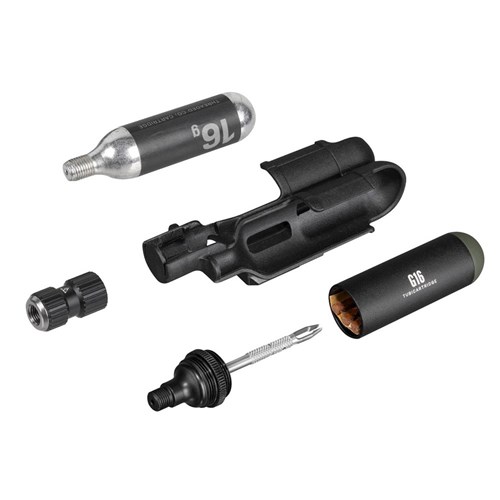 Ultra compact, race ready tubeless tire repair and CO2 inflation kit features a Nano AirBooster CO2 inflator, TubiCartridge G16, and 16g CO2 cartidge. Mounts to saddle rail with included Duo Fixer which provides dual use with Topeak Duo Fixer system accessories, including Topeak QuickClick saddle bags, CO2 inflators, lights, and fenders. A simple slide and click is all it takes to go on a safe and secure ride.