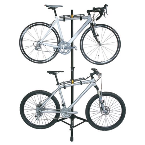 Multi-bike storage system is solid enough to serve as a light duty portable work stand. Constructed of aluminum tubing, the center pillar extends to almost seven feet while tripod legs provide a stable base. Can store up to four bikes with optional bike hangers