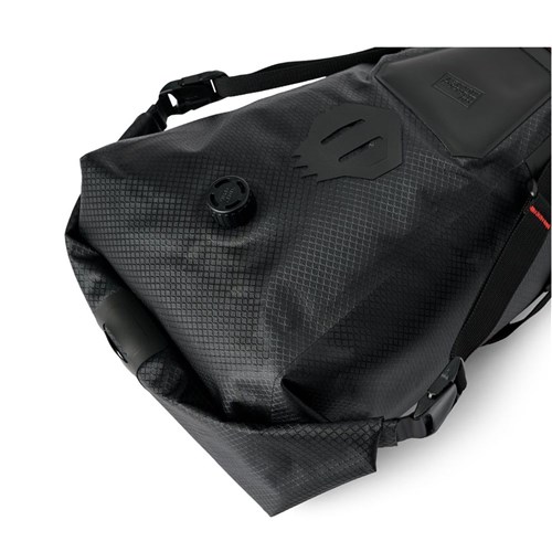 Easy to fit, waterproof one-piece saddle bag holds 8 Litres of gear. The skull icon is outlined in Hypalon to provide an extra external attachment point for lights or other essentials. The rolltop back has hypalon patches with rear light attachment points. The bag itself has an air valve to remove excess volume and compress the load. The straps go around the seat and seat post to keep it secure and vertically bounce free.