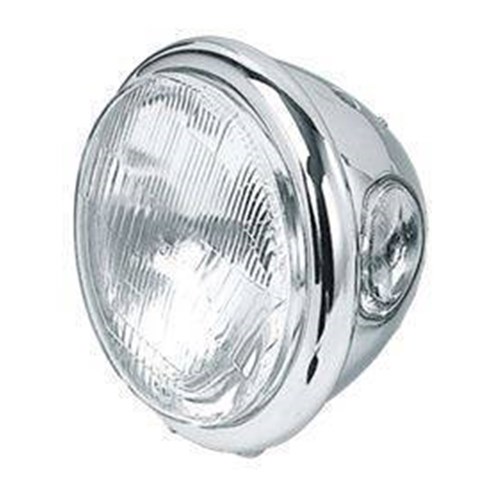 Complete assembled, Show-Chromed, Custom style headlights with bottom or side mount and with or without built-in blue high-beam indicator light.