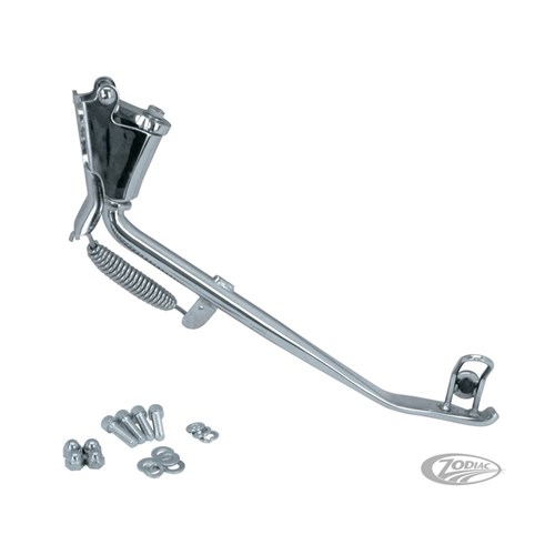 Complete stock style kickstand kits. Available in stock length, as well as in a 1" shortened version for use on lowered bikes. Both kits have a show chrome finish.