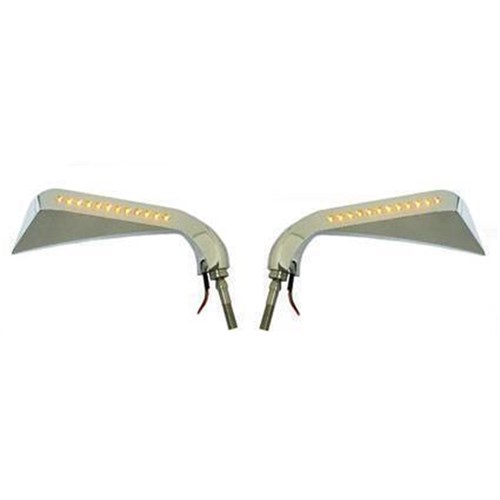 State of the art design mirrors with the stem as an integral part of the mirror head. Clear looking and amber lighting LEDs that can be wired as turn signal and/or running lights.