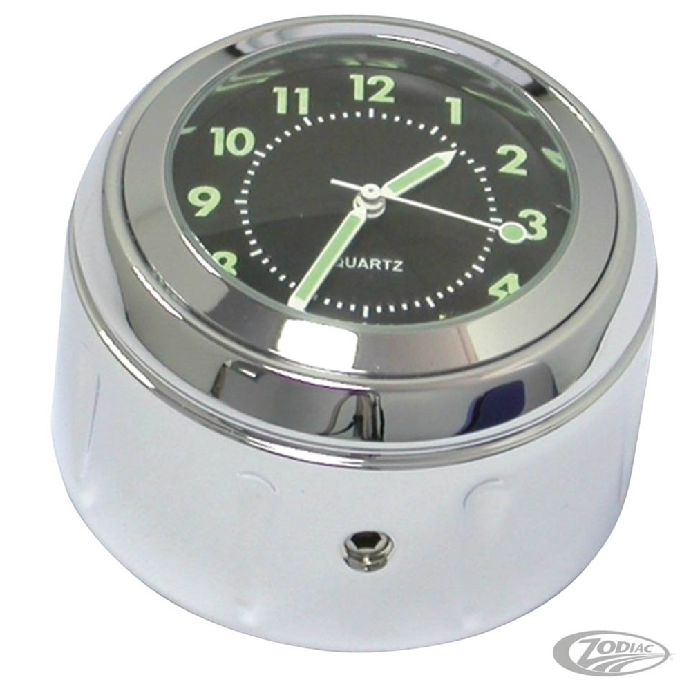 Cased in a beautiful chrome or black CNC aluminium housing, these water-resistant instruments are easy to install and functional accessories with a luminous display. Clock is battery operated.