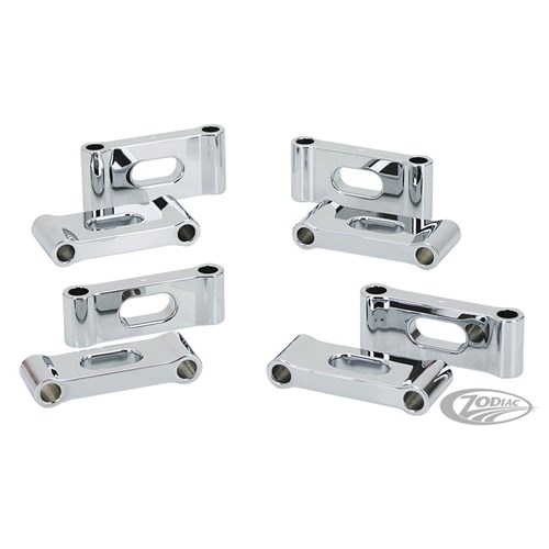 Chrome plated front fender spacers that are machined out of billet aluminum. Spacers have 2 3/4" (70mm) centre to centre distance 5/16" mounting holes.