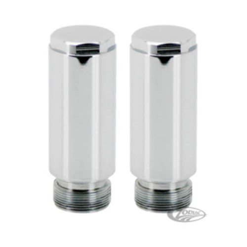 Now you can get a longer front fork without having to install longer inner fork tubes. These fork tube extensions replace the stock fork tube caps and are made from solid, hi-grade steel with a chrome finish. Available for most 39, 41 and 49mm applications in 2" (5 cm), 4" (10 cm) and 6" (15 cm) length. Most bikes can use 2" or 4" extensions without the need for longer brake lines, 6" extensions however must always be installed with longer brake lines. Fork tube extensions are sold in pairs.
