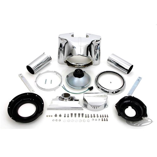 Convert your Heritage Softail or Fat Boy from the stock headlight "tins" to the later model headlight housing with this complete kit. It includes the chrome plated two-piece aluminium headlight housing with all necessary mounting brackets, headlight bucket, chrome slider covers as well as covers for the lower triple tree and handlebar risers. This stylish kit bolts directly to the existing Original Equipment triple trees on all Heritage Softail and Fat Boy 1986-2006 with 1" handlebars. Bikes with 1 1/4" handlebars, 2007-2017 Fat Boy and all 2009-2017 Softail require modifications. A wider head lamp trim ring that makes the headlamp housing even look longer is available separately.